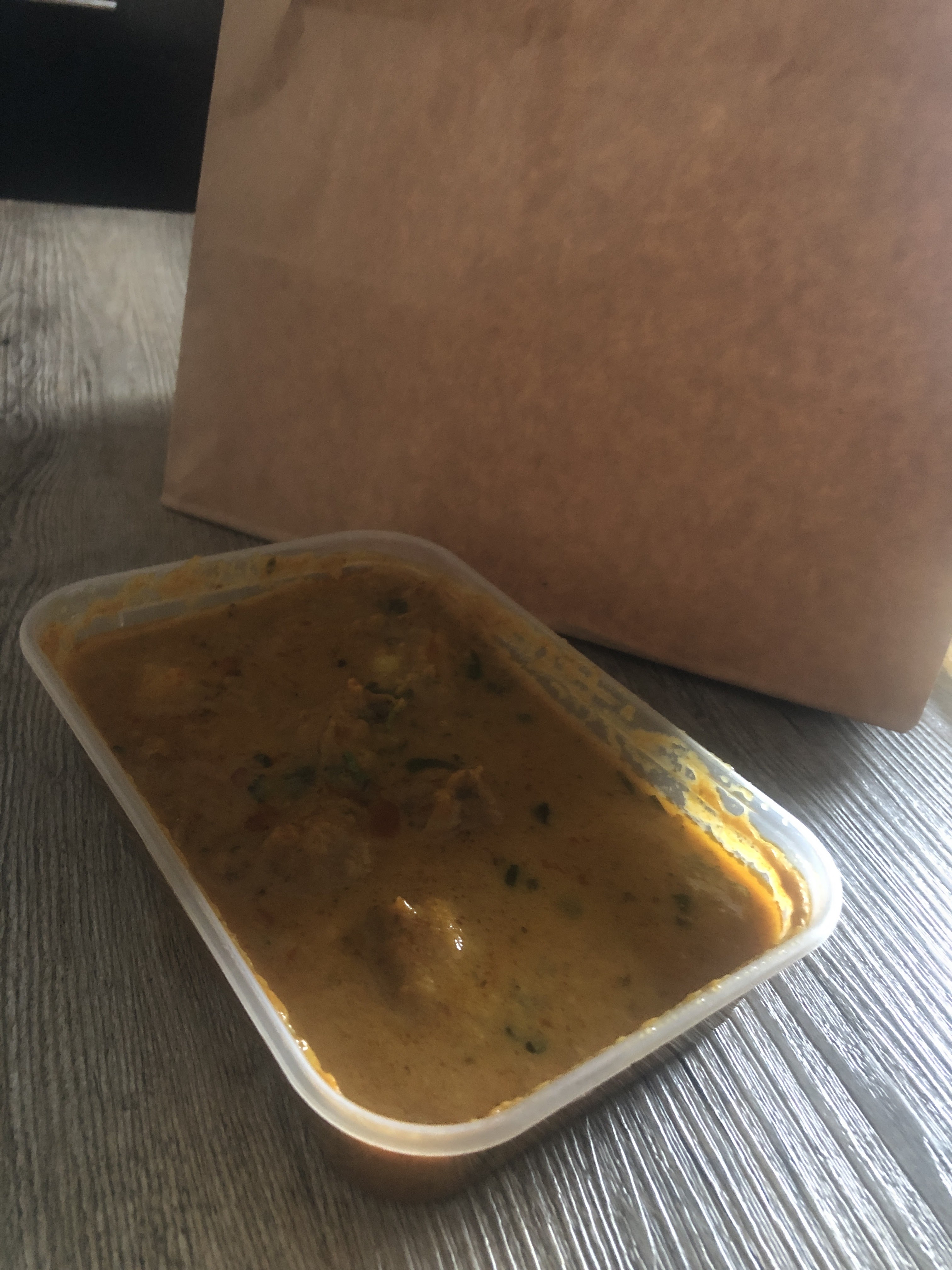 J'ai demandé un curry végétarien, ma commande a été ratée et j'ai eu du poulet au curry à emporter. Seule la personne sans abri à qui je donnais ma nourriture pouvait dire si la nourriture était bonne.