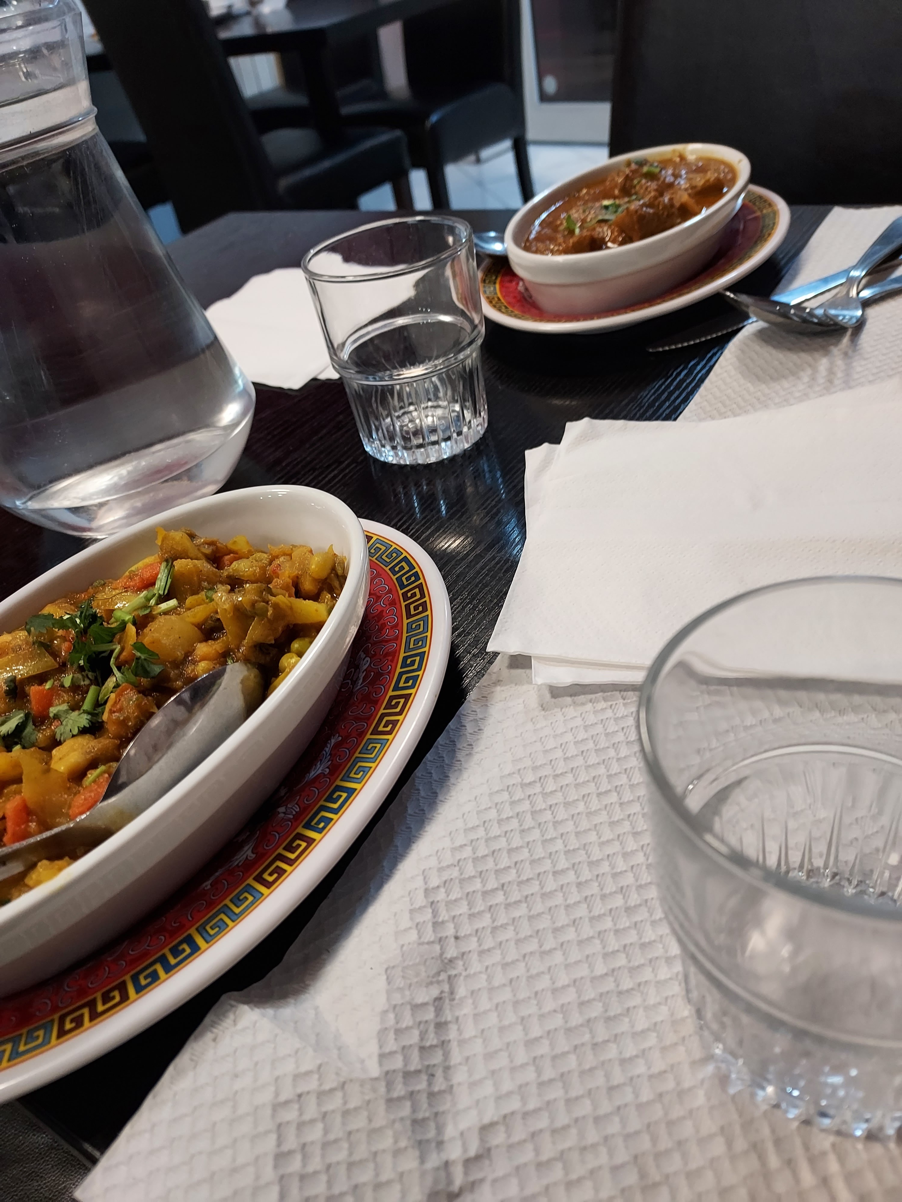 Patron sympa Nos entrées (beignets oignons et sticks/roulés de viande) ne sortaient pas de la friteuse, elles ont été réchauffées. Donc tout mou et pas craquant Seulement 2 petites sauces d’accompagnements (d’habitude il y en a 3 chez les indiens, il manquait la sucrée). Agneau curry apprécié par mon compagnon Agneau madras pas assez relevé, la sauce avait un goût de soupe de légumes sans épices Le riz est servi généreusement